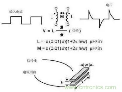 流經電路板走線的開關電流將引起電壓發(fā)生變化,電路板走線存在寄生電感,可采用如下公式計算電壓的變化:V = LdI/dt。其中:V = 電壓的變化,L = 電路板走線感抗,dI = 流經走線的電流變化,dt =電流變化的時間。