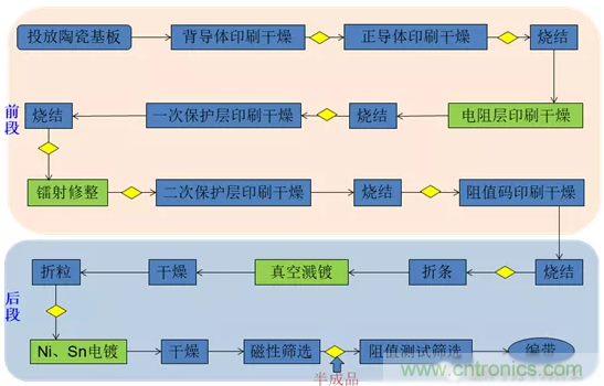 常規厚膜片式電阻的完整生產流程大致如下: