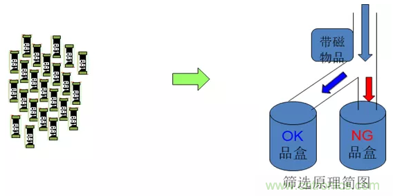 【原理】不良品的磁性小,吸引力小,進行篩選時會自動掉落到不良品盒,良品掉落到良品盒。