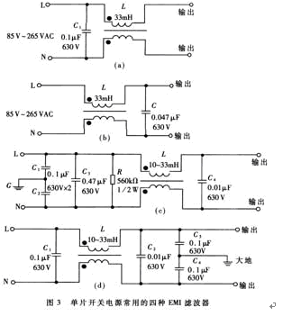 圖(a)與圖(b)中的電容器C能濾除串模干擾,區別僅是圖(a)將C接在輸入端, 圖(b)則接到輸出端。圖(c)、(d)所示電路較復雜,抑制干擾的效果更佳。圖(c)中的L、C1和C2用來濾除共模干擾,C3和C4濾除串模干擾。R為泄放電阻,可將C3上積累的電荷泄放掉,避免因電荷積累而影響濾波特性;斷電后還能使電源的進線端L、N不帶電,保證使用的安全性。圖(d)則是把共模干擾濾波電容C3和C4接在輸出端。