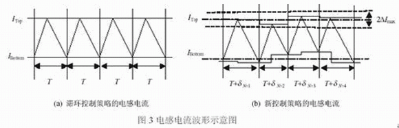 [page] 如圖2所示為一種常見的DC/DC控制策略——滯環控制策略。該控制策略限定了電感電流波動的最大值ITop和最小值Ibotton,電感電流波形如圖3a所示。此時,電感電流為周期的,變換器有固定的開關周期T。設電感電流為ILp(t),則