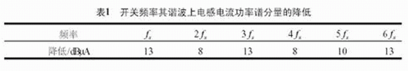 仿真結果如圖5所示,為了便于同EMC標準對照,電流功率譜采用對數表示。在開關頻率fs及各次諧波上電流的減小如表1所示。