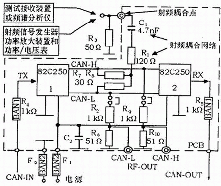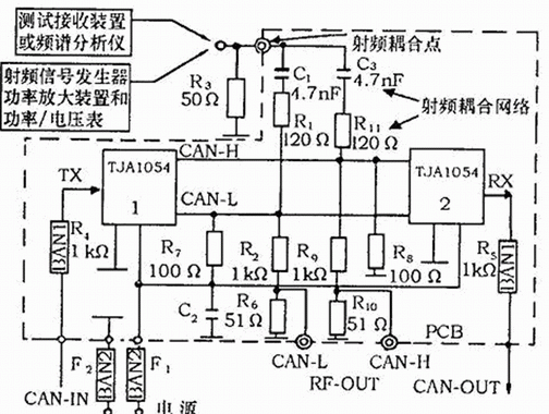 單線CAN通過單根總線連接,一般應用于低速場合,典型傳輸速率33 kb/s,最多可連接32個節點。圖3所示的測試PCB上安裝了兩個單線CAN收發器AU 5790,電源線BAN2(包含電源濾波電感器)濾波器F1和F2給收發器提供工作電壓。收發器1接收經BAN1(包含1 kΩ的串聯電阻)輸入的CAN信息,并經CAN-H發送到收發器2,收發器2再將信息經BAN1從測試板輸出。測試儀器通過射頻耦合網絡與CAN-H連接。