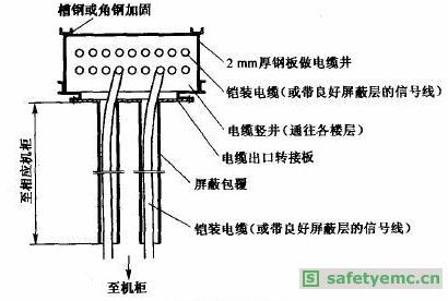 (3)電纜豎井處的電纜進出由于電纜豎井是作為同一個屏蔽區域,從電纜豎井至各層機房(非屏蔽區)的管線處理也非常重要。做法如圖2所示