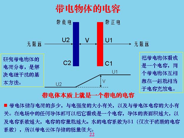 我們給大家介紹一個很重要的概念,就是電容。這個電容和我們現(xiàn)在電路里面用的電容是兩個概念,大家不要混淆。任何帶電體我們都可以把它看成一個電容,電容的大小跟它帶的電壓和電荷的多少有關(guān),如果帶的電荷越多,電壓越高它的電流就越大。電容的概念其實(shí)與電荷的概念也是互相對應(yīng)的,我們把這個電容器看成是兩個電容進(jìn)行串聯(lián),也就是說帶電體帶正電,帶正電是對于無限遠(yuǎn)的地方來說的,為什么呢?因?yàn)檫@個帶電以后電場分布是發(fā)散性的,中間這一點(diǎn)是最強(qiáng),離的越遠(yuǎn)的時候電感強(qiáng)度就越來越低,當(dāng)無限遠(yuǎn)的時候就等于零,你不能拿它來參考地球,參考地球的話相當(dāng)于范圍太小,本身地球也可以看成電容,所以分析電容的時候最好用無限遠(yuǎn)的地方作為參考點(diǎn)。也就是說我們計(jì)算電容的時候以無限遠(yuǎn)的地方考慮,計(jì)算電容也是以無限遠(yuǎn)的地方考慮。把這兩個電容靠在一起的時候就變成了電容器,你就可以利用這兩個電容的電位梯度和電容器來分析。任何一個帶電體都可以看成一個電容,一個孤立球?qū)w的電容等于表面積除以半徑,再乘以電容系數(shù)。地球的容量算出來就是7×10-4(F),把兩個孤立電容進(jìn)行推導(dǎo),算出來就是這樣,電容器正好等于上面儲存的電容量除以電位差。明白電容的概念以后,也要分析電路的電磁感應(yīng)方面,要有量的概念。有了量的概念我們可以對電磁干擾進(jìn)行分析,比如說這邊是一個干擾電壓,通過這條電路進(jìn)行供電,旁邊也有一個電路,這個電路就會受到干擾,干擾怎么計(jì)算?它的導(dǎo)向電路是什么?我們可以把兩個導(dǎo)線看成一個電容器,就是有一個耦合電容。等效電路相當(dāng)于這邊,你要減少兩個回路互相干擾的程度就必須要減少上面的Cm電容,把兩條線隔得越遠(yuǎn)越好,而且越短越好,只要面積越小電容器越小,離得越遠(yuǎn)電容器也越小。