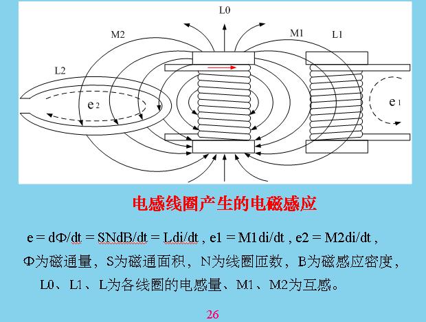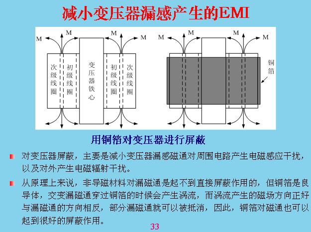 這個更加具體,有電力穿過的時候會產(chǎn)生電力線,電力線會產(chǎn)生共模干擾,這幾個都是共模干擾,那些都是差模干擾。這些干擾主要是如何產(chǎn)生的?本身線路里面只有電流流過,構(gòu)成一個線圈或?qū)Ь€都會產(chǎn)生干擾,最大的是變壓器漏感,這是其他回路的好幾十倍。所以變壓器漏感最好進(jìn)行屏蔽?怎么屏蔽呢?在線圈的外邊用一層金屬,鋁片也好,銅片也好,一般用銅片包起來,包起來應(yīng)該讓它短路,就是用焊絲焊起來,漏感在上面也會產(chǎn)生渦流,一產(chǎn)生渦流就會產(chǎn)生抵消干擾的磁場,就相當(dāng)于把漏感抵消掉。
