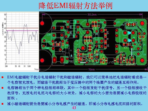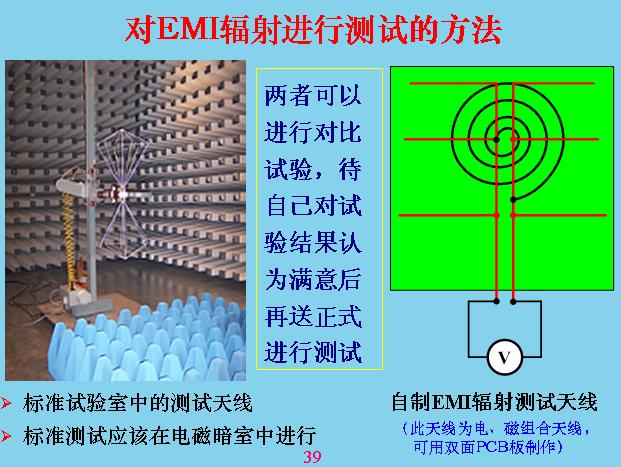 另外對于輻射干擾,我們最注意的就是共模干擾,差模干擾相對來說比共模干擾小很多,我們做過一個試驗(yàn),在同一個導(dǎo)線里面流過的電容,相差的共模干擾是2500倍。上面就是對輻射進(jìn)行測試,剛才是共模干擾,其他都是傳導(dǎo)測試,其實(shí)就是輻射干擾測試,一般就是用天線來測,天線的測試原理就是這樣的,量天線和大地之間的電壓,這個設(shè)備與大地之間有分布電容,前面已經(jīng)說過了,放這個在上面,與板接地產(chǎn)生分布電容。天線也有分布電容,分布電容不是跟設(shè)備大小和距離有關(guān),所以測試的時候都有一個標(biāo)準(zhǔn),固定設(shè)備中間距離有多遠(yuǎn),天線面積用多大,還有一套天線,很多天線,不只是一個,計(jì)最大的那個,就是測試電壓最大的那個,天線對輻射會產(chǎn)生諧振。