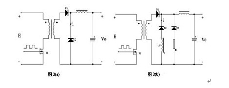 在圖3(a)所示的正激電源電路中,當(dāng)初級功率管V1開始導(dǎo)通,次級整流二極管D1開始導(dǎo)通,D2開始截止時,由于二極管PN結(jié)的電荷存儲效應(yīng),D2中流過了電流變化率di/dt很大的反向恢復(fù)尖峰電流i,致使V1、D1中也有相應(yīng)的尖峰電流流過,在漏感、線電感等因素的共同作用下會在電源輸出端產(chǎn)生高頻的導(dǎo)通噪聲。在D2上施加的反向電壓越大,D2的反向恢復(fù)時間越長,反向恢復(fù)電流變化率di/dt就越大,電源輸出噪聲也就越大。大的反向恢復(fù)尖峰電流,不僅會產(chǎn)生電源噪聲,也容易損壞整流器件。[page]