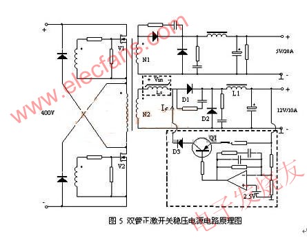 磁放大器穩(wěn)壓是利用可飽和電感導(dǎo)通延時的物理特性來控制開關(guān)電源的占空比和輸出功率,穩(wěn)定電源輸出電壓的一種方法。在可飽和電感上加上適當(dāng)?shù)牟蓸雍涂刂圃{(diào)節(jié)其導(dǎo)通延時的時間,就可以構(gòu)成最常見的磁放大器穩(wěn)壓電路。圖5是一個輸入為110Vac~220Vac/50HZ,輸出為5Vdc/20A,12Vdc/10A的雙管正激開關(guān)穩(wěn)壓電源,其中5V是主控回路。其輔路12V輸出電流較大,對穩(wěn)壓精度和負載穩(wěn)定度都有較高要求,采用普通的方法穩(wěn)壓效果都不是很理想,如果采用磁放大器穩(wěn)壓技術(shù)就可圓滿解決這一問題,使穩(wěn)壓電路的結(jié)構(gòu)簡單,耗散功率小,并可達到毫伏級的穩(wěn)壓精度。