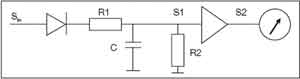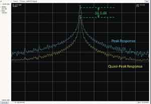 盡管許多EMI測量可以使用簡單的峰值檢波器完成,但EMI測量標準規定了一種專用測量方法,即準峰值(QP)檢波器。QP檢波器用來檢測信號包絡加權后的峰值(準峰值)。它根據信號時長和重復率加權多個信號。QP檢波器的特點是響應快、衰減慢,包含一個表示臨界阻尼表的時間常數。發生頻次較高的信號,其QP測量值要高于偶發的脈沖。