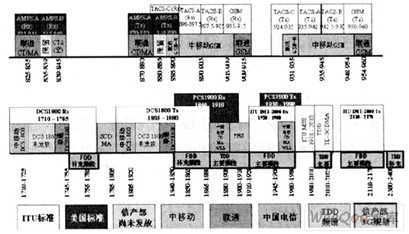 我國現有的無線與移動通信頻譜具體分配情況如圖1所示,此外,WLAN使用無需許可的ISM頻段,UWB使用3.5/5.8G頻段,而WiMAX和RFID尚未最終確定頻段,其 中WiMAX有可能分配在2.5G、3.5G或5.8G頻段。