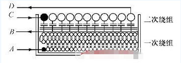 在開關電源中,輸入整流后的電流為尖脈沖電流,開關開通和關斷時變換器中電壓、電流變化率很高,這些波形中含有豐富的高頻諧波。另外,在主開關管開關過程和整流二極管反向恢復過程中,電路的寄生電感、電容會發生高頻振蕩,以上這些都是電磁干擾的來源。開關電源中存在大量的分布電容,這些分布電容給電磁干擾的傳遞提供了通路,如圖2所示。圖2中,LISN為線性阻抗穩定網絡,用于線路傳導干擾的測量。干擾信號通過導線、寄生電容等傳遞到變換器的輸入、輸出端,形成了傳導干擾。變壓器的各繞組之間也存在著大量的寄生電容,如圖3所示。圖3中,A、B、C、D4點與圖1中標識的4點相對應。
