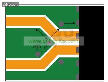時(shí)鐘分布或合成器設(shè)備路由出來、用于承載相同頻率的跡線集群可能相鄰而行,因?yàn)楦蓴_源音調(diào)已經(jīng)存在于接收器線路上。不過,分組的線路最終會(huì)分散。分散時(shí),應(yīng)在分散線路之間提供接地灌流,并在其開始分散的地方灌入通孔,以便感應(yīng)回流沿著額定回流路徑流回。在圖3中,接地島末端的通孔可使感應(yīng)電流流到參考層上。接地灌流上其它通孔之間的間隔不要超過一個(gè)波長的十分之一,以確保接地不會(huì)成為共振結(jié)構(gòu)。