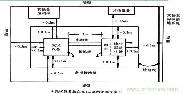 ① 試驗應在試驗室中央進行,除位于試品及試驗儀器下方的參考接地板外,它們與其他所有導電性結構(例如屏蔽室里的墻壁和實驗室里的其他有金屬結構的試驗儀器和設備)之間的最小距離為0.5m,以避免脈沖群干擾中輻射成分的反射,再與原先的干擾疊加,對試驗結果產生影響。
