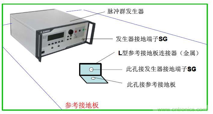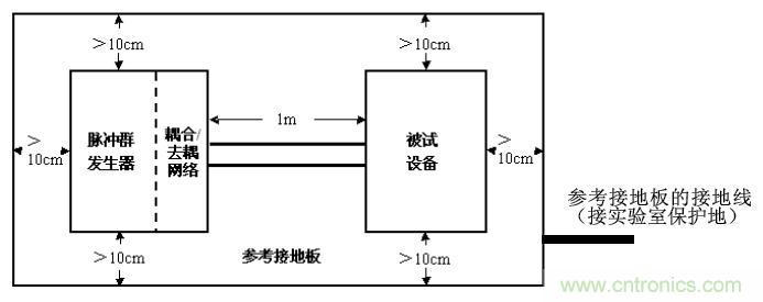 ③ 試驗儀器(包括脈沖群發生器和耦合/去耦網絡)放在參考接地板上。試驗儀器用盡可能粗短的接地電纜與參考接地板連接,并要求在連接處的阻抗盡可能地小。