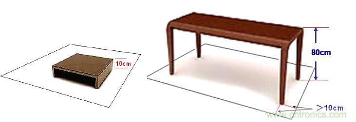 ④ 落地的試品要用0.1±0.01m的絕緣座隔開后放在參考接地板上。對于臺式試品,應放置在離參考接地板高度為0.8±0.08m的木頭臺子上,試品(或試驗臺子)距參考接地板邊緣的最小尺寸滿足項①(0.1m)的規定。
