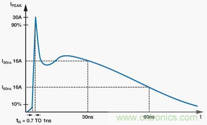 圖1顯示了規(guī)范所述的8 kV接觸放電電流波形。一些關(guān)鍵波形參數(shù)包括小于1 ns的上升時(shí)間和大約60 ns的脈沖寬度。這說(shuō)明脈沖總能量約為數(shù)十mJ。