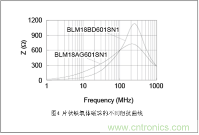 一般來(lái)說(shuō),片狀鐵氧體磁珠是以100MHz的阻抗值來(lái)決定其規(guī)格的。但與此同時(shí), 也存在著諸多擁有相同阻抗值的不同產(chǎn)品,這是因?yàn)樗鼈兊那€形狀各不相同。圖4所示的就是其中一例。BLM18AG601SN1與 BLM18BD601SN1都是100MHz阻抗值為600Ω的片狀鐵氧體磁珠,但從它們的阻抗波形可以看出,與BLM18AG601SN1較為平穩(wěn)上升 的曲線相比,BLM18BD601SN1的曲線則呈急速上升的趨勢(shì)。