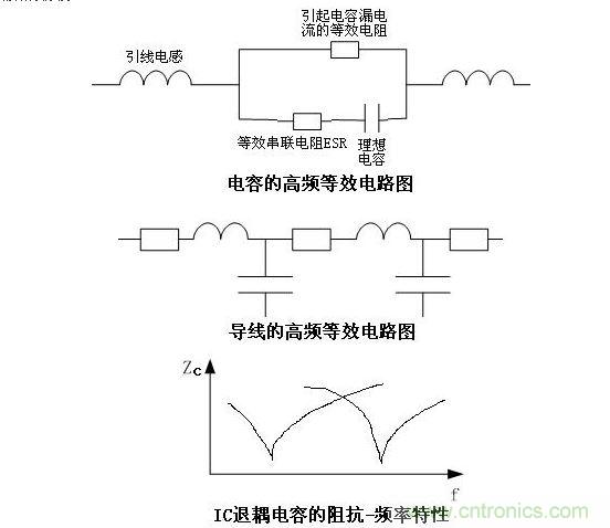 電容,在中低頻或直流情況下,就是一個(gè)儲(chǔ)能組件,只表現(xiàn)為一個(gè)電容的特性,但在高頻情況下,它就不僅僅是個(gè)電容了,它有一個(gè)理想電容的特性,有漏電流(在高頻等效電路上表現(xiàn)為R),有引線電感,還在導(dǎo)致電壓脈沖波動(dòng)情況下發(fā)熱的ESR(等效串聯(lián)電阻),(如圖)。從這個(gè)圖上分析,能幫我們設(shè)計(jì)師得出很多有益的設(shè)計(jì)思路。第一,按照常規(guī)思路,1/2πfc是電容的容抗,應(yīng)該是頻率越高,容抗越小,濾波效果越好,即越高頻的雜波越容易被泄放掉,但事實(shí)并非如此,因?yàn)橐€電感的存在,一支電容僅僅在其1/2πfc=2πf L等式成立的時(shí)候,才是整體阻抗最小的時(shí)候,濾波效果才最好,頻率高了低了都會(huì)濾波效果下降,由此就可以分析出結(jié)論,為什么在IC的VCC端都會(huì)加兩支電容,一支電解的,一支瓷片的,并且容值一般相差100倍以上多一點(diǎn)。就是兩支不同的電容的諧振頻率點(diǎn)岔開了一段距離,既利于對稍高頻的濾波,也利于對較低頻的濾波。