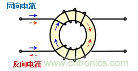 作為CAN和車載Ethernet這種差分接口的噪聲對策產品,一般會使用共模扼流圈。共模扼流圈的基本構造如圖1所示:一個磁芯里面有兩根繞線。這兩個繞線對應的逆向電流流過時磁芯里產生的磁通會相互反向抵消,而同向的電流流過時磁通會相互向同方向產生,因此阻抗較高。通過這種方式共模扼流圈可以通過相互反向的差分信號但是卻可以抑制同向傳輸的共模噪聲。