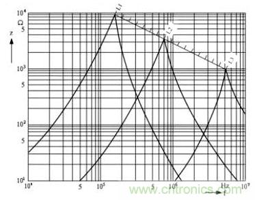 由圖中可以看出,電感線圈的阻抗開始的時候是隨著頻率升高而增大的,但當(dāng)它的阻抗增大到最大值以后,阻抗反而隨著 頻率升高而迅速下降,這是因為并聯(lián)分布電容的作用。當(dāng)阻抗增到最大值的地方,就是電感線圈的分布電容與等效電感產(chǎn)生并聯(lián)諧振的地方。圖中,L1 > L2 > L3,由此可知電感線圈的電感量越大,其諧振頻率就越低。從圖2中可以看出,如果要對頻率為1MHZ的干擾信號進(jìn)行抑制,選用L1倒不如選用L3,因為 L3的電感量要比L1小十幾倍,因此L3的成本也要比L1低很多。