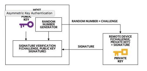 基于非對稱加密的安全認證依賴于兩個密鑰:私鑰和公鑰。只有被認證的設備知道私鑰,而公鑰可透露給希望對設備進行安全認證的任何一方。與上文中討論的方法一樣,主機向設備發(fā)送質詢。設備根據(jù)質詢和私鑰計算數(shù)字簽名,并將其發(fā)送給主機(圖2)。但此時,主機使用公鑰對數(shù)字簽名進行驗證。用于計算數(shù)字簽名的函數(shù)擁有特定數(shù)學屬性至關重要。非對稱方法中最常用的函數(shù)是RSA和ECDSA。同樣,設備也在不泄露密鑰情況下提交了自己知道密鑰的證明,即私鑰。