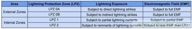 IEC/BS EN 62305避雷防護標準將雷擊風險分為以下三類:直接雷擊;間接雷擊;以及雷擊造成的電磁能量。如表1所示,在避雷防護規劃中,需要將各區域劃分為高風險區域(或稱避雷防護區域)以及雷擊潛在損害區域。上述標準將雷擊可能導致的損害分為以下三類:1)活體傷害;2)結構的物理性損壞;3)內部系統的失效。一般而言,對于任何可能給人類造成傷害的事物,均須設置層層預防措施。舉例而言,為了保障內部人員的生命安全,醫院需要在外部結構和內部設備兩個層面設置大量的緩沖設施。