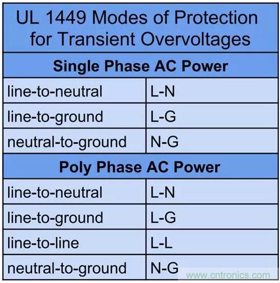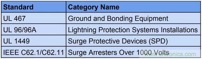 美國保險商實驗室(Underwriter’s Laboratory)所列的數種避雷防護標準主要針對浪涌保護中采用的設備(見表2)。其中,浪涌保護器件標準UL1449規定了瞬態電壓電氣路徑在各種系統供電方式下所需采取的保護模式。