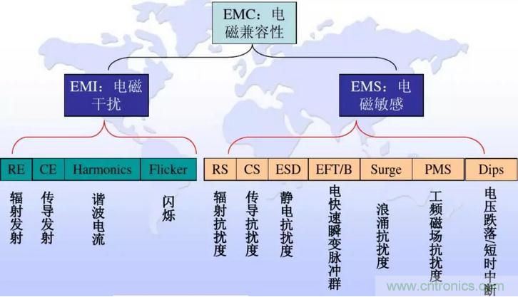 電磁兼容性(EMC)是指設(shè)備或系統(tǒng)在電磁環(huán)境中符合要求運(yùn)行并不對(duì)其環(huán)境中的任何設(shè)備產(chǎn)生無法忍受的電磁干擾能力,電磁兼容(EMC)包含電磁干擾(EMI)和電磁抗擾度(EMS)。其包含的測(cè)試項(xiàng)目如圖1所示。