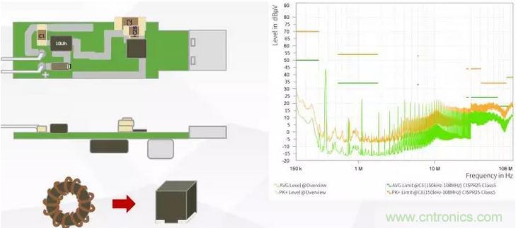 環(huán)形電感的漏磁較大,體積也比較大,對(duì)大地也有比較大的耦合電容,因此其對(duì)外的輻射更大,如圖8所示將環(huán)形電感替換為貼片電感后整體的EMI就會(huì)下降很多。