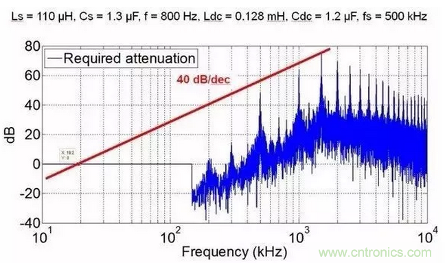 我知道很多人會說,怎么可能,di/dt和dv/dt都大了,怎么可能EMI濾波體積還小了。我想說一句,共模和差模濾波器的沒有區(qū)別,相同的截止頻率下,高頻的衰減更大!就算你高頻下共模噪聲越大,但是你的記住,這個頻率下LC濾波器的衰減更大,想想幅頻曲線吧。為了說明這個結論,我給出一些定量分析結果。這些EMI分析均基于AC/DC三相整流,拓撲為維也納整流。我分別給出了1Mhz和500Khz的共模噪聲,可以看出,500khz共模濾波器需要的截止頻率為19.2kHz,1MHz為31.2kHz。