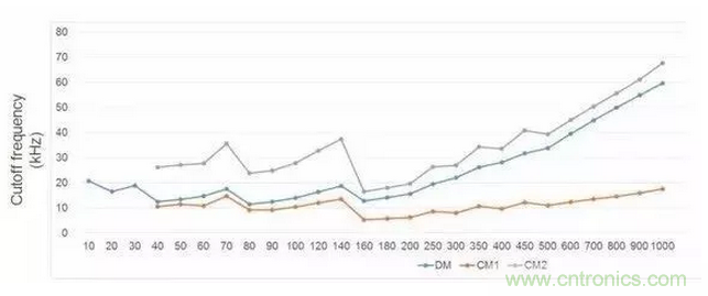 這張圖給出了不同頻率下共模和差模濾波器轉折頻率的關系,可以看出,一些低頻點EMI濾波器體現(xiàn)出了非常好的特性。例如70Khz,140Khz。而這兩個開關頻率是工業(yè)界常用的兩個開關頻率,非常討巧,因為EMI噪聲測試是150KHz到30MHz。不過這個也與拓撲有關。