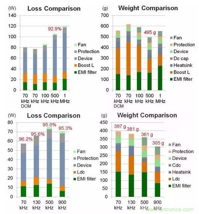 2、慎重選擇開關頻率,開關頻率會極大的影響整個變化器的功率密度,而且針對不同器件,拓撲,最佳的開關頻率是變化的。