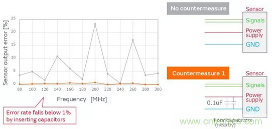 傳感器的電源線受噪聲影響,會發生傳感器輸出值的異常(輸出誤差)。將注入電源線的噪聲級固定,對對策前后的輸出誤差的大小進行調查。