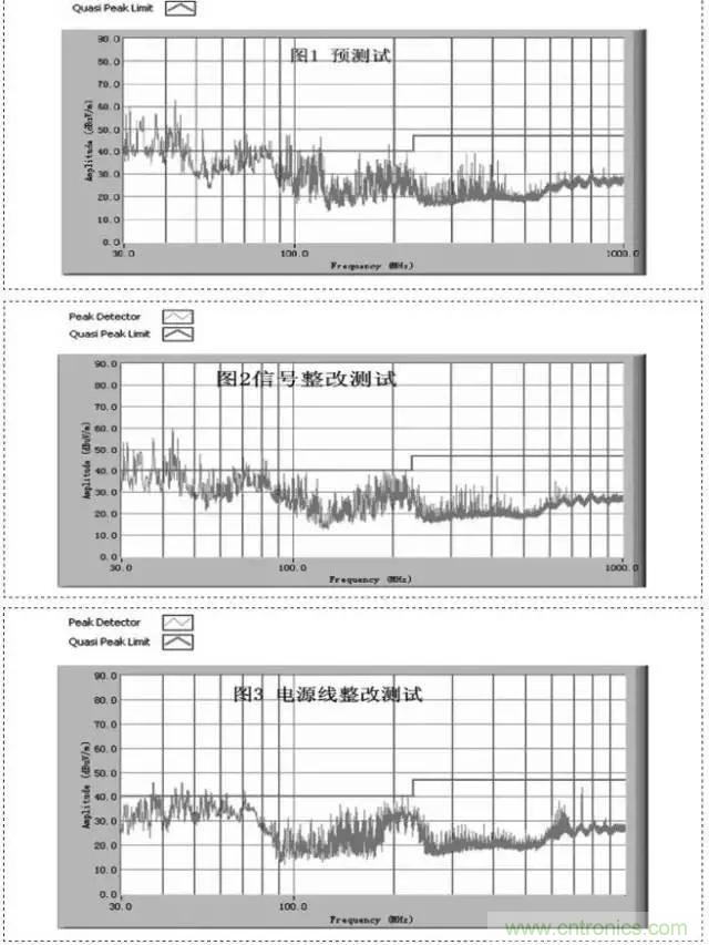 由于該LED顯示產品本身采用高端的開關電源、設有瞬態電壓抑制器、走線規范,從檢測結果可以得到除了發射以外,其他各項測試均順利通過,因此,發射成為了LED顯示產品通過EMC認證需要攻克的重點問題。根據以往的測量數據來看, LED顯示屏的開關電源、控制卡和內部信號傳輸都會產生不同程度的電磁輻射。另外, LED顯示屏的工作原理是通過調整發光管上電流脈沖的參數來實現高灰度、高刷新,因此,顯示屏的刷新率要求越高,系統卡上信號頻率也隨之提高,產生的輻射干擾就越強,這是顯示屏高品質應用的必然結果,也是顯示屏最主要的電磁騷擾源之一。