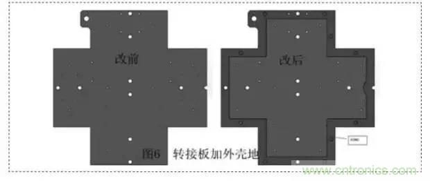 當LED面陣驅動板增加兩層接地,由原先的4層板變成6層板,能起到較好防止輻射的作用。當轉接板周邊附整邊銅箔,并與金屬箱體用螺釘緊固,形成外殼地,從而達到對信號起到屏蔽作用(圖6)。