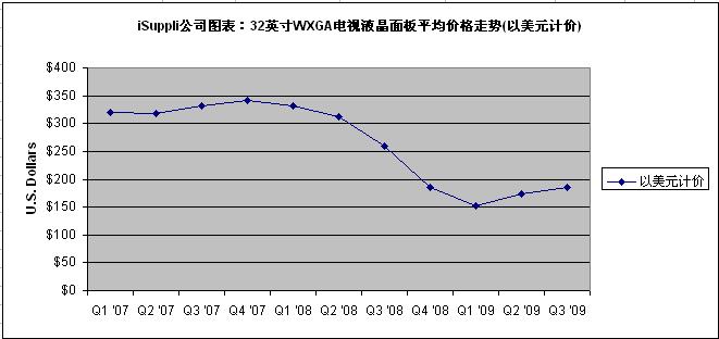 附圖所示為iSuppli公司對于2008年10月至2009年第四季度結束時32英寸WXGA TV LCD面板市場的價格預估。這種面板價格可以體現出整體市場趨勢。