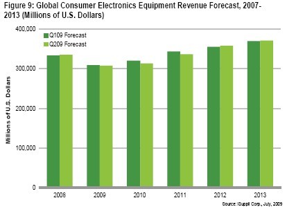 圖9所示為iSuppli對(duì)2008年至2013年期間全球消費(fèi)電子設(shè)備營(yíng)收的預(yù)測(cè)。