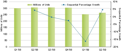 據(jù)iSuppli公司,第二季度全球手機出貨量比第一季度增長4.7%,這是自2008年第三季度以來首次出現(xiàn)環(huán)比增長。第二季度全球手機出貨量為2.65億部,而第一季度是2.53億部。