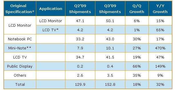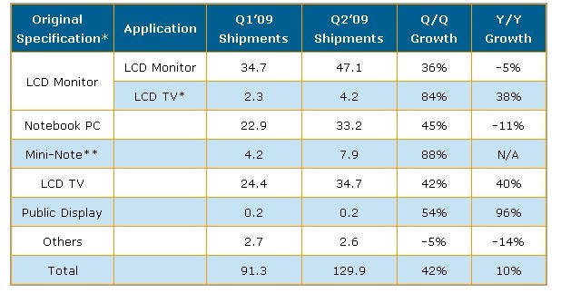 - 2009年Q2全球10寸以上TFT LCD出貨量達1億3千萬片,環比增長42%,同比增長10%