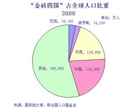 圖1:2008年金磚四國(guó)占全球人口比重。數(shù)據(jù)來源:中國(guó)國(guó)家統(tǒng)計(jì)局,聯(lián)合國(guó)人口基金會(huì)