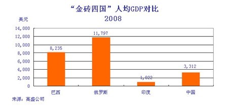 圖4:2008年金磚四國(guó)人均GDP對(duì)比。數(shù)據(jù)來源:高盛