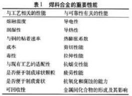微電子領(lǐng)域使用的焊料有著很?chē)?yán)格的性能要求,無(wú)鉛焊料也不例外,不僅包括電學(xué)和力學(xué)性能,還必須具有理想的熔融溫度。從制造工藝和可靠性?xún)煞矫婵紤],表1列出了焊料合金的一些重要性能。