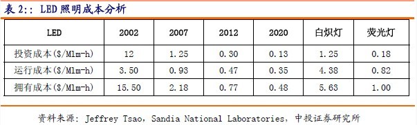 根據(jù)美國圣地亞國家實(shí)驗(yàn)室所做的LED照明成本分析,投資成本是將一個(gè)燈泡的購買成本(每兆流明)分?jǐn)偟秸麄€(gè)壽命周期,運(yùn)行成本是指一個(gè)燈泡在運(yùn)行時(shí)的成本(每兆流明時(shí)),擁有成本是投資成本和運(yùn)行成本之和,反映了一個(gè)燈泡從購買、運(yùn)行到壽終整個(gè)生命周期的總成本。到2010年LED的擁有成本降至0.77美元每兆流明時(shí),將低于熒光燈的1美元每兆流明時(shí),到2020年LED的擁有成本將降至0.48美元每兆流明時(shí),只有熒光燈的一半。