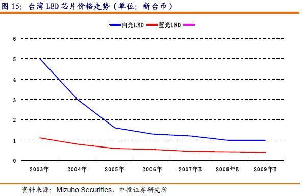2004年臺(tái)灣廠商生產(chǎn)的藍(lán)光LED價(jià)格跌幅達(dá)到30%,2004年底藍(lán)光LED報(bào)價(jià)已跌至新臺(tái)幣0.60-0.80元,05年藍(lán)光LED的價(jià)格跌勢趨緩,全年跌幅在15%。預(yù)計(jì)08年全年跌幅在10%左右。