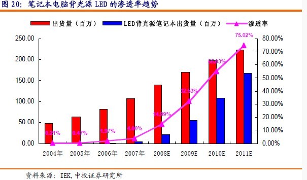 預(yù)計(jì)筆記本電腦的出貨量將從2004年的47.1百萬臺(tái)增長到2011年的223百萬臺(tái),其中采用LED背光源的筆記本電腦將從2004年的0.1百萬臺(tái)增長到2011年的167百萬臺(tái)左右,滲透率2011年將達(dá)到75%左右,而在2004年滲透率只有0.2%。其中每部筆記本電腦用LED顆數(shù)是40-60個(gè)。