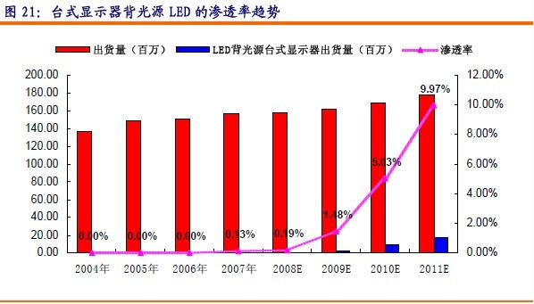 預(yù)計(jì)臺(tái)式顯示器的出貨量將從2007年的156.6百萬臺(tái)增長到2011年的177.5百萬臺(tái),其中采用LED背光源的臺(tái)式顯示器將從2007年的0.2百萬臺(tái)增長到2011年的17.7百萬臺(tái)左右,滲透率從2007年的0.1%上升到2011年的10%左右。其中每臺(tái)顯示器用lLED數(shù)量為60個(gè)左右。