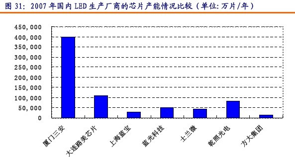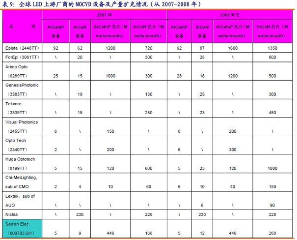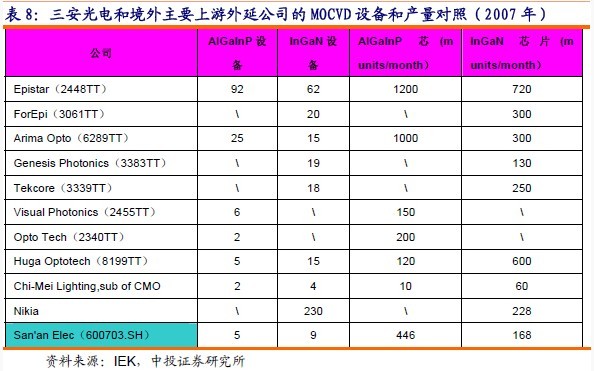 我們以截止2007年底為止,對三安光電和臺(tái)灣上游外延廠商的MOCVD設(shè)備及外延片、芯片產(chǎn)能進(jìn)行比較。