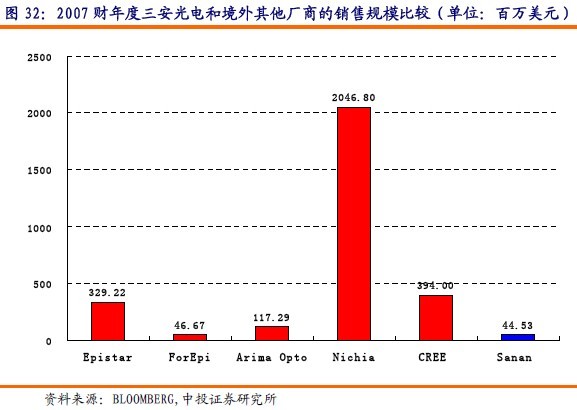 三安光電2007年的銷售規(guī)模為44.53百萬美元,其規(guī)模和臺(tái)灣的璨圓光電規(guī)模相當(dāng),但和臺(tái)灣的晶圓光電、華上光電及美國的CREE公司相比,其銷售規(guī)模還有比較大的差距。