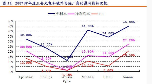 從盈利指標(biāo)來看,2007年度三安光電的銷售毛利率達(dá)到45%,凈利潤率達(dá)到27.2%,REO為20.50%,遠(yuǎn)高于其他國際大廠的盈利指標(biāo)。其中可能的原因分析來看,國內(nèi)MOCVD設(shè)備折舊年限、國內(nèi)制造費(fèi)用先對較低、臺(tái)灣廠商進(jìn)入2008年實(shí)行股權(quán)、股票、分紅等激勵(lì)措施的原因造成國內(nèi)上游LED廠商的盈利能力平均高于國外廠商。